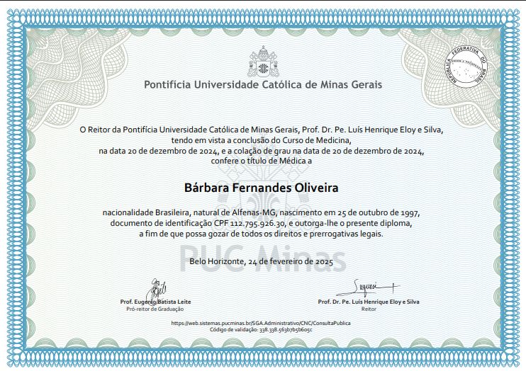 - Médica pela Pontifícia Universidade Católica de Minas Gerais